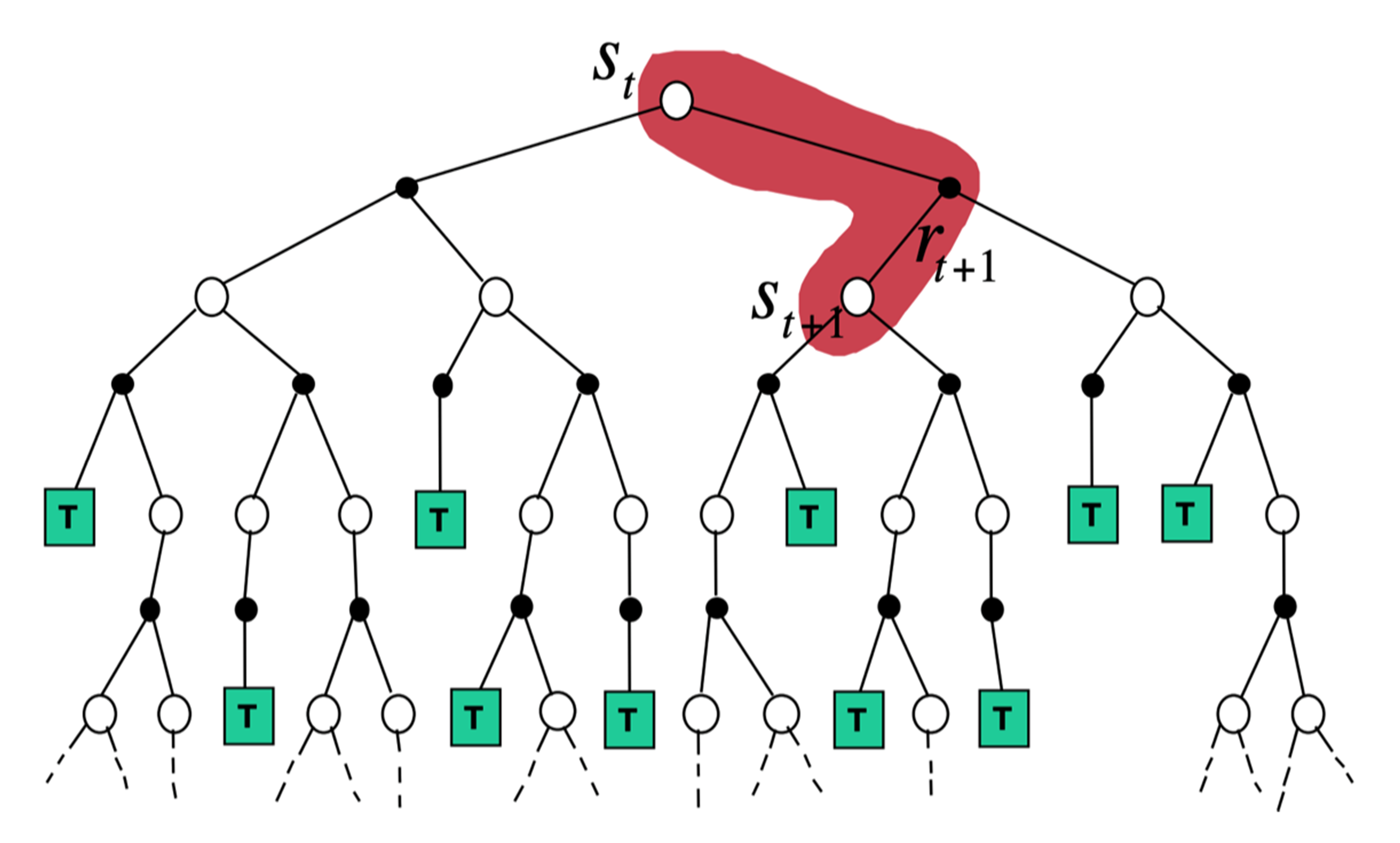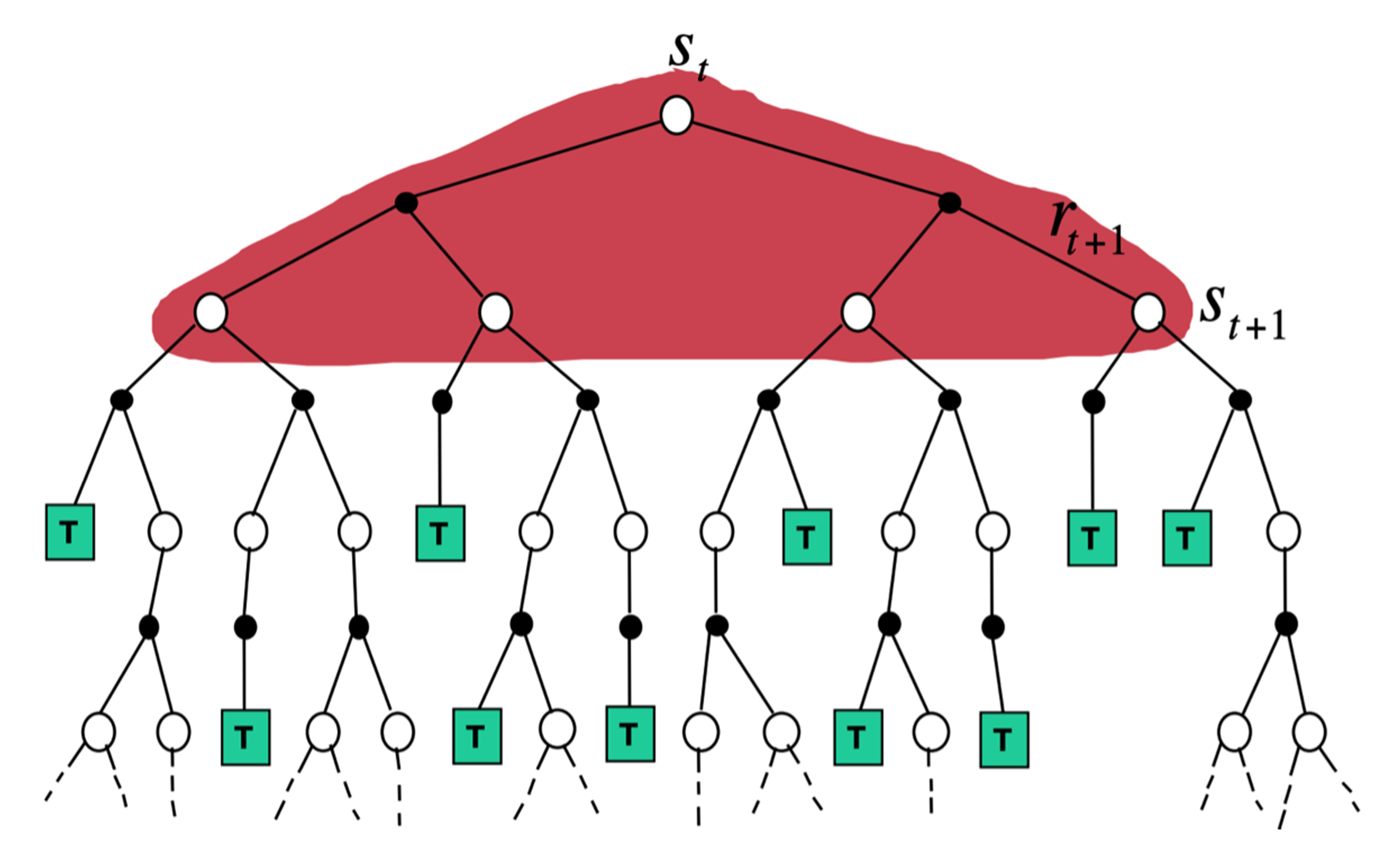 动态规划:直接计算期望,将所有相关状态加和,即: \[ V(s_t)\leftarrow\mathbb{E}_{\pi}[r_{t+1}+\gamma V(s_{t+1})] \]