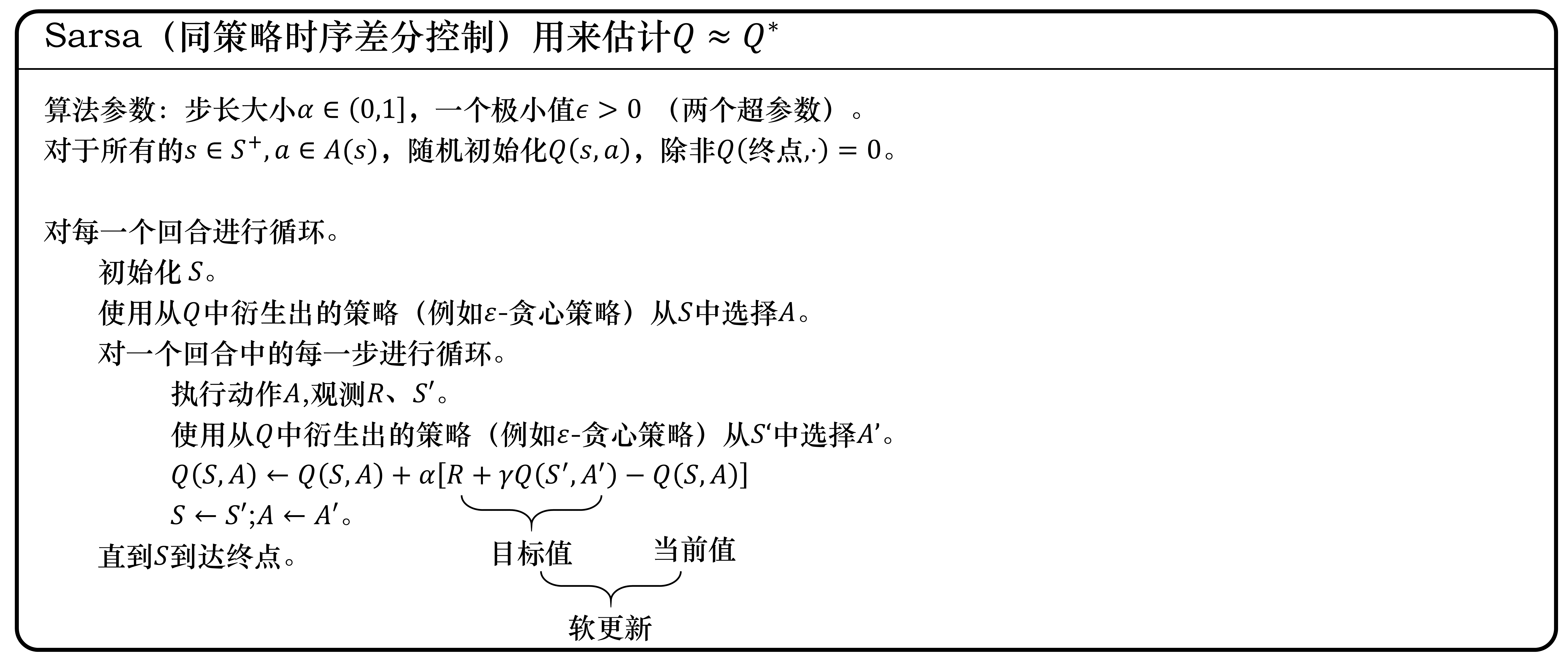 \[ Q(s_t, a_t)\leftarrow Q(s_t, a_t)+\alpha[r_{t+1}+\gamma Q(s_{t+1}, a_{t+1})-Q(s_t, a_t)] \]