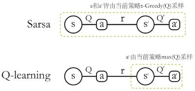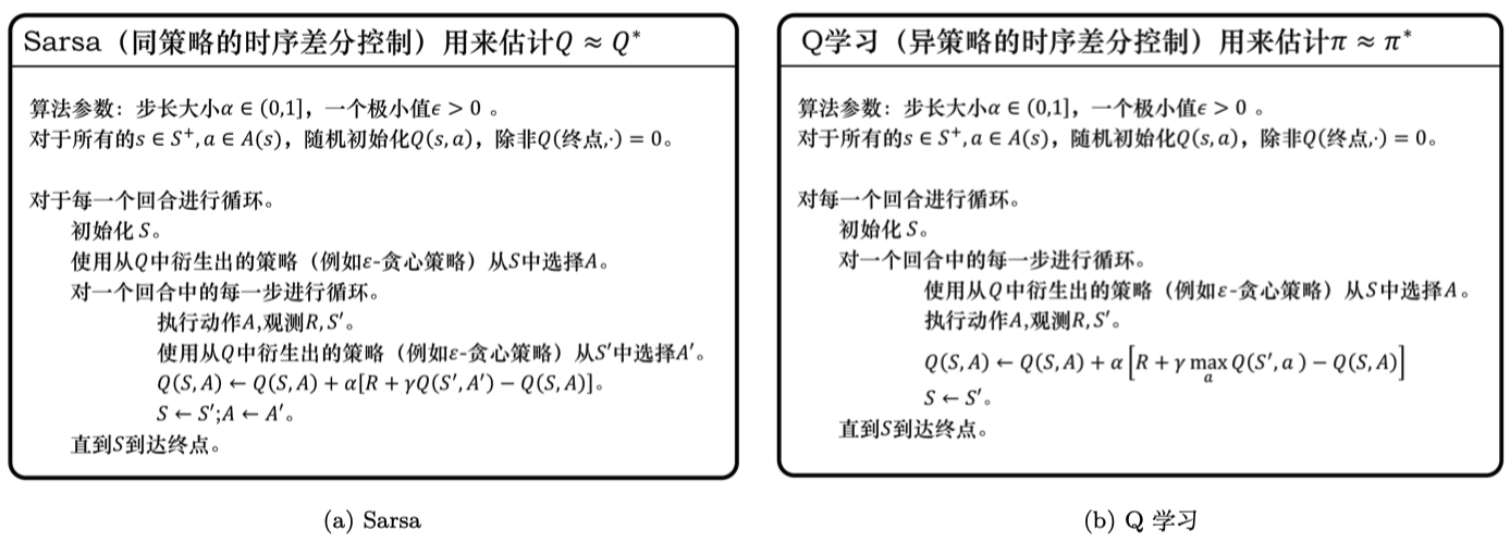 Q-learning 和 Sarsa 的更新公式相同,区别在于目标计算:Sarsa 是\(r_{t+1}+\gamma Q(s_{t+1}, a_{t+1})\),Q-learning 是\(r_{t+1}+\gamma\max_a Q(s_{t+1}, a)\).