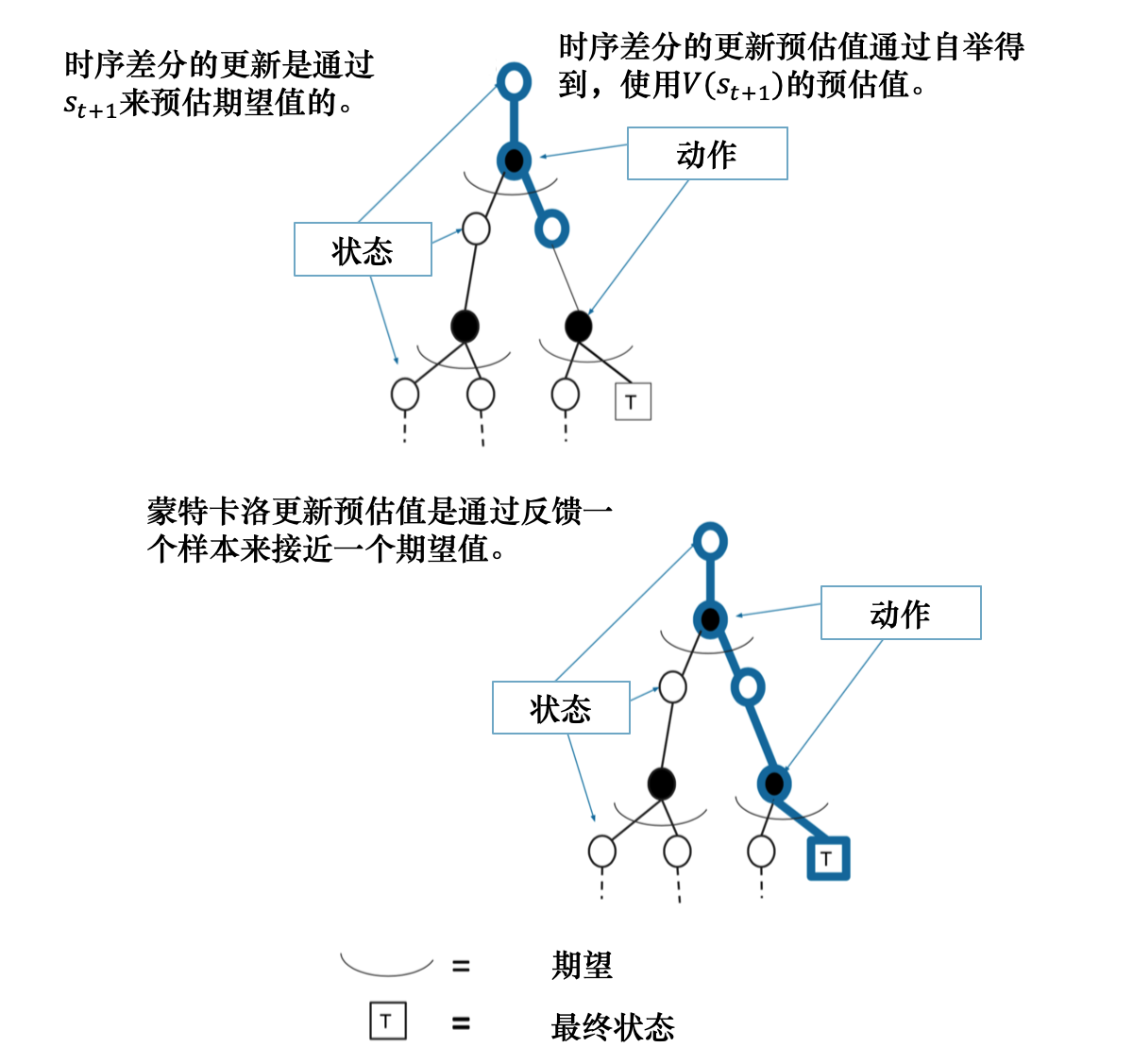 蒙特卡洛方法采用第一行更新;时序差分方法采用最后一行更新。