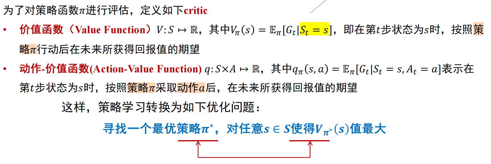 - 对于价值函数的评判器(Vπ(S)):对于策略π,评判状态s的好坏;输出值与当前策略π有关