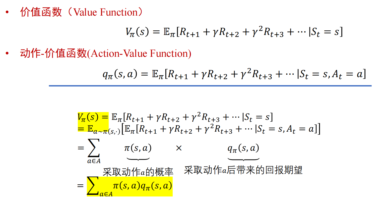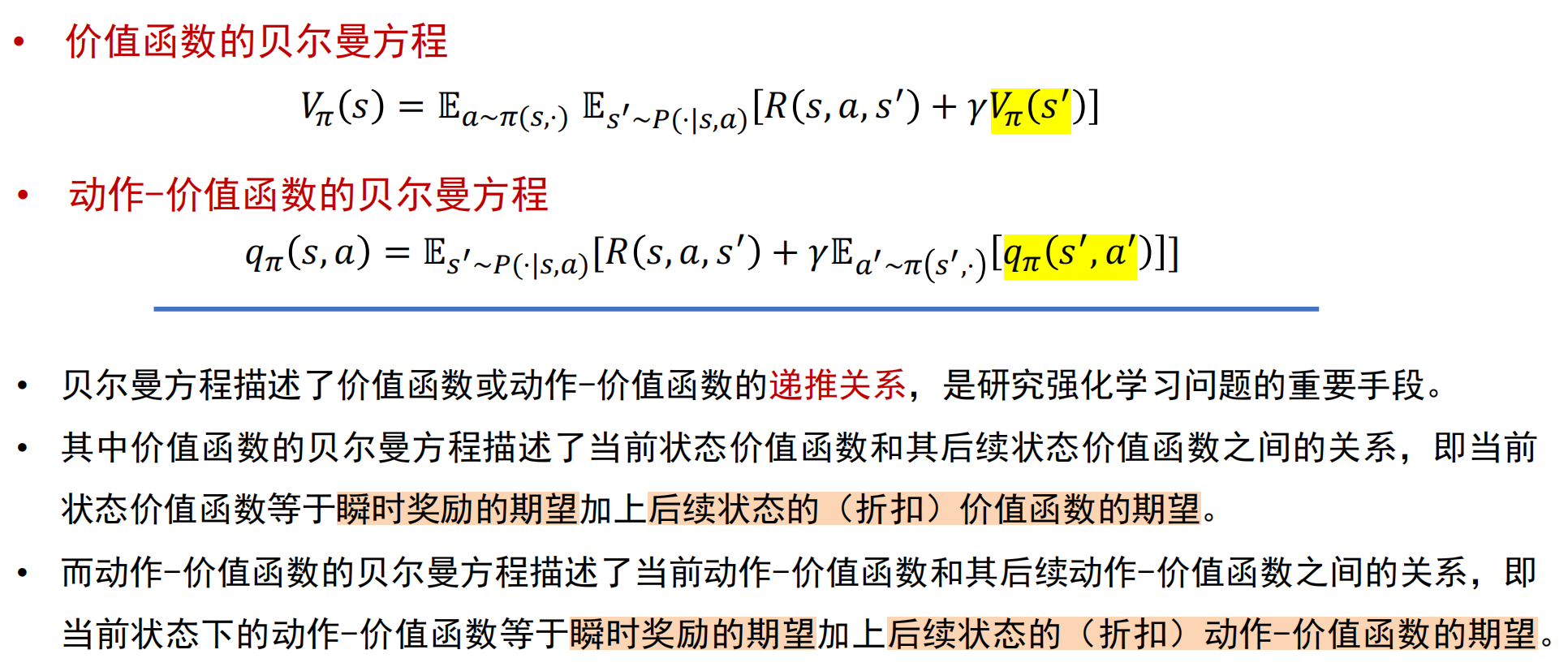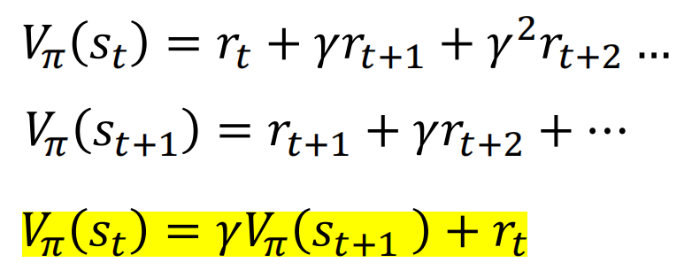 - 价值函数取值与时间无关,只与以下因素相关:策略π、在策略π下从某个状态转移到其后续状态所取得的回报、在后续所得回报有关