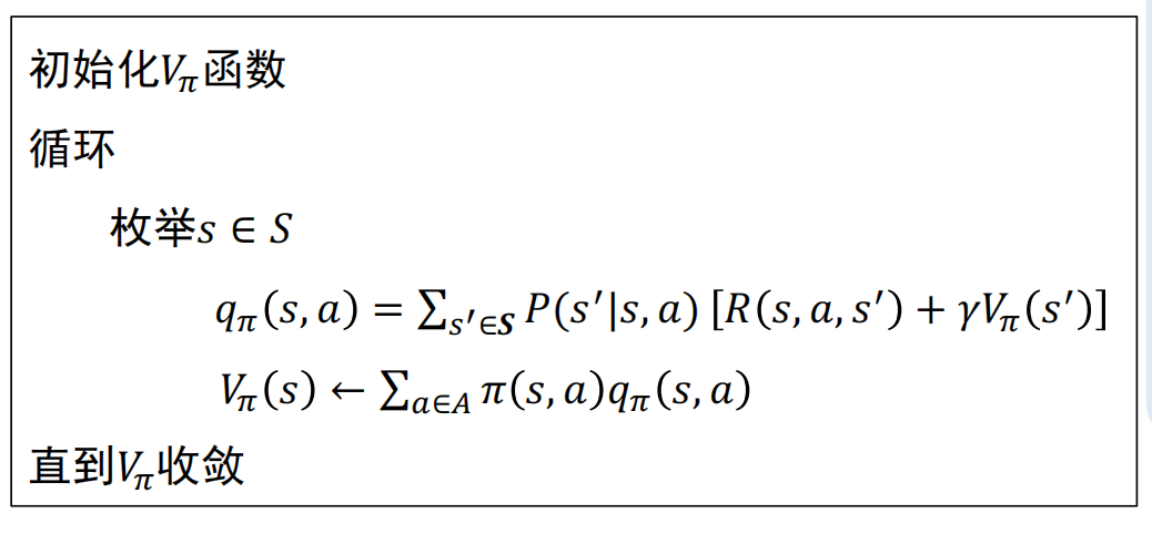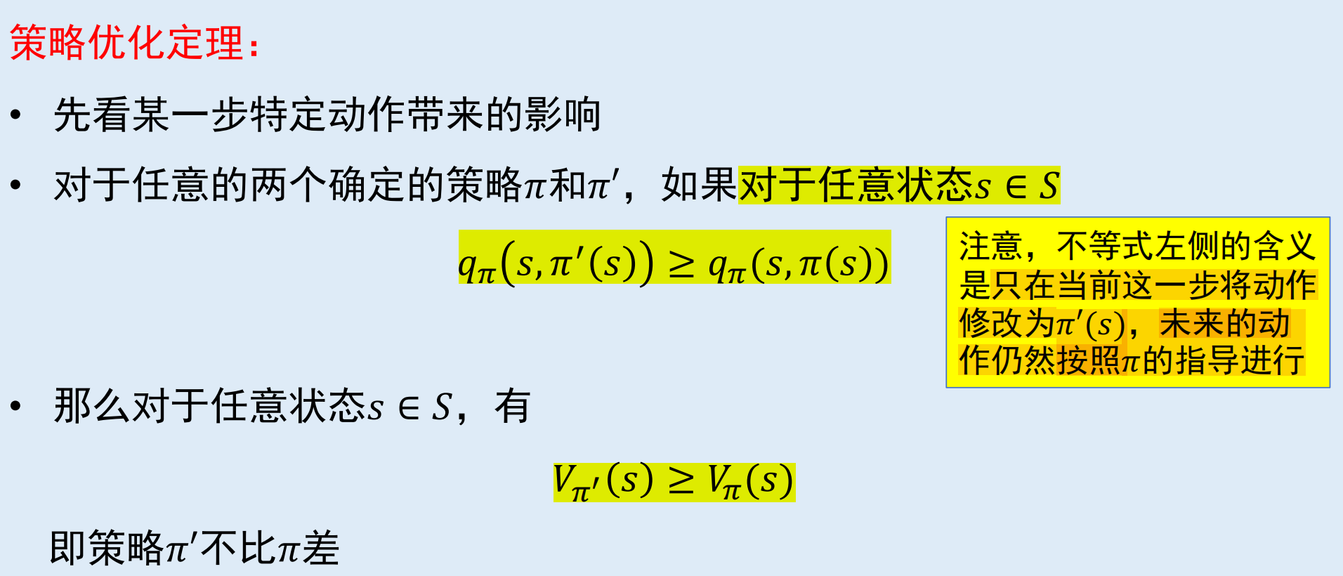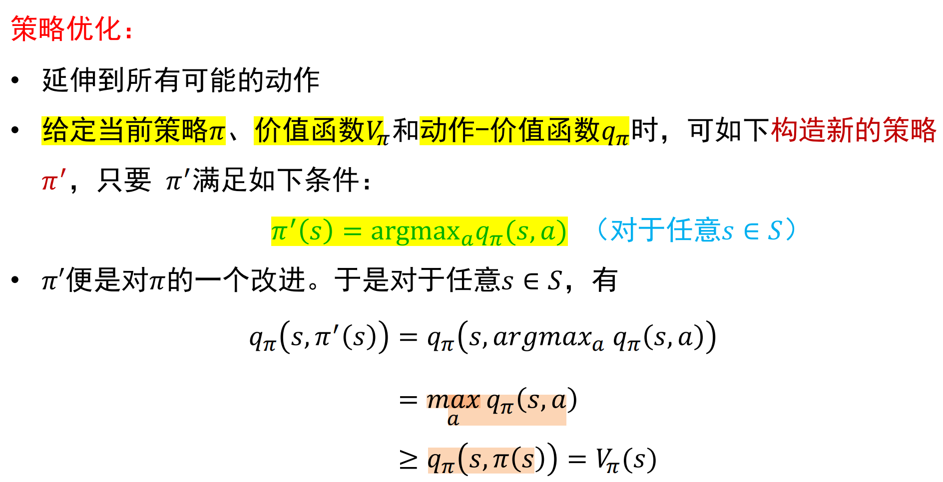 - 2.策略优化:根据价值函数Vπ(S)调整策略π;