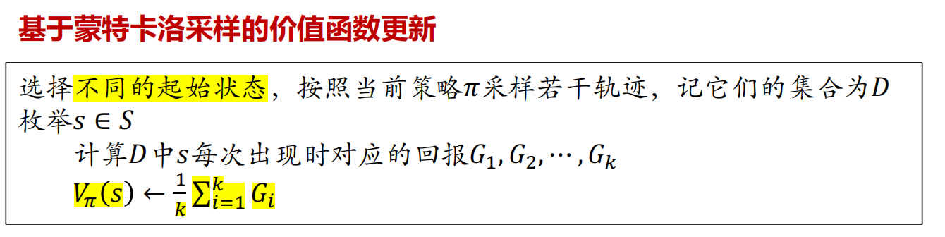 大数定理指出:对于独立同分布的样本数据,当样本足够大的时候,样本平均值向期望值收敛。 思想:采样;通过样本均值估计期望 * 若为确定的策略,每个起点只有一个轨迹。