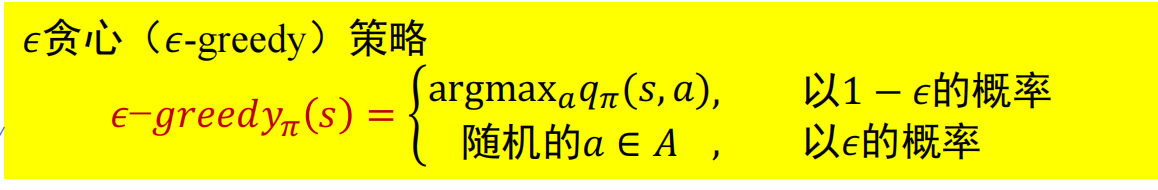 - ε贪心策略:在状态s,采样动作a时: 以1-ε的概率选择带来最大回报的动作,以ε的概率随机选择一个动作。