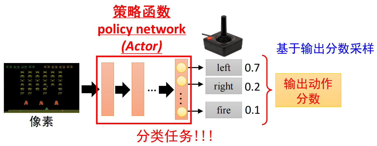 1.定义带有未知参数的函数: 输入:向量/矩阵形式的状态数据 输出:每个神经元对应的动作,基于输出分数对动作采样(具备一定的随机性)