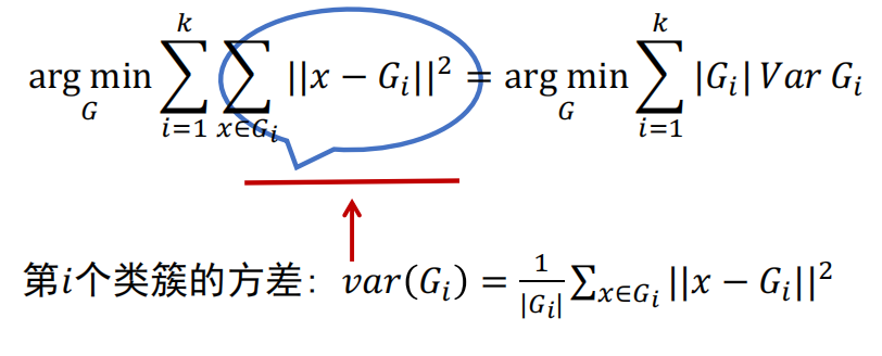 - 2.将每个未聚类数据xi,分别放入:与之距离最近聚类质心所在聚类集合:argmin d(xi,cj)