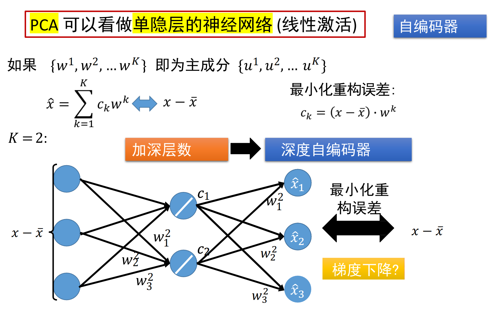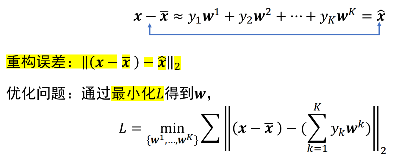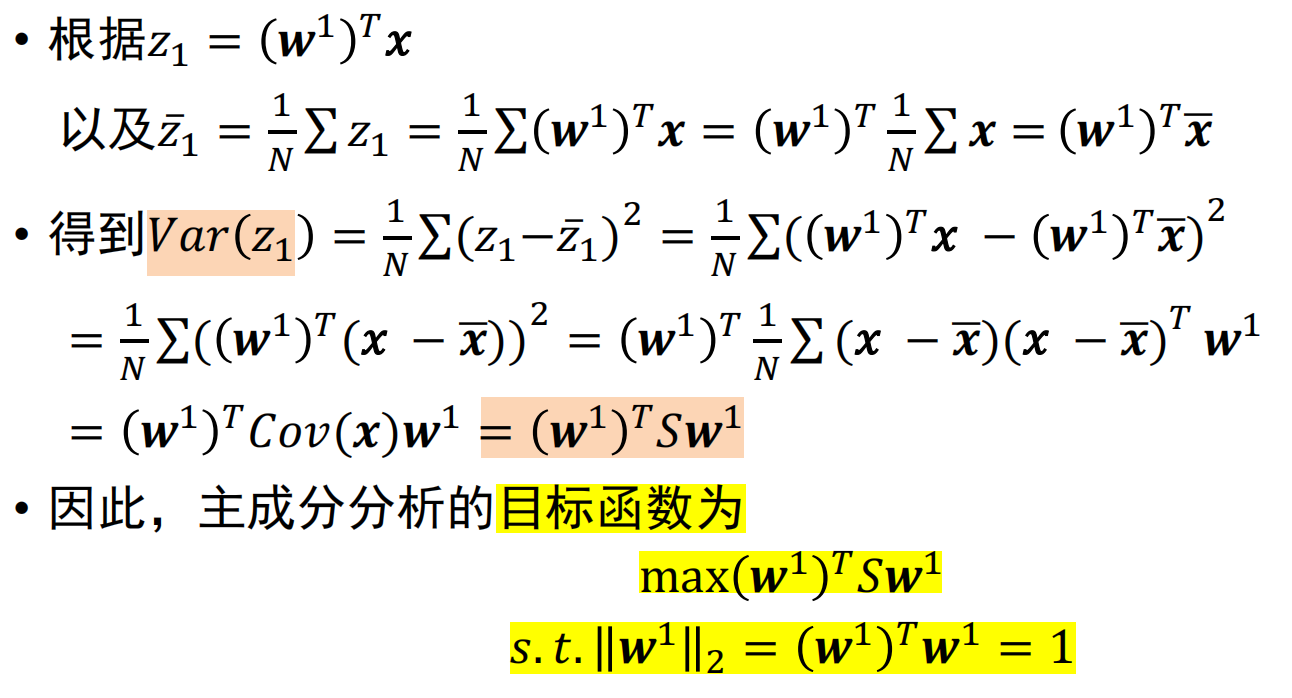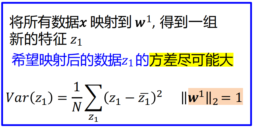 - 思想:降维,原始数据投影至一个新的坐标系,使得:投影后数据方差最大