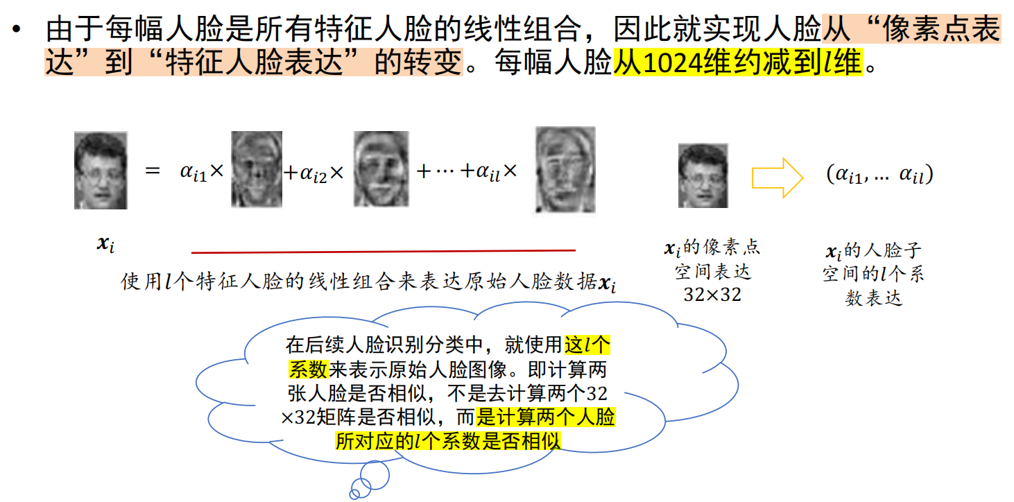 n个1024维人脸样本数据,降维至l维 * 定义: - 人脸样本数据:32x32图像->1024x1列向量 - l个特征人脸:映射矩阵W(1024x1024):每个特征向量均为1024x1的列向量,可还原成32x32的人脸图像,因此称为:特征人脸。 - 人脸的新表达: