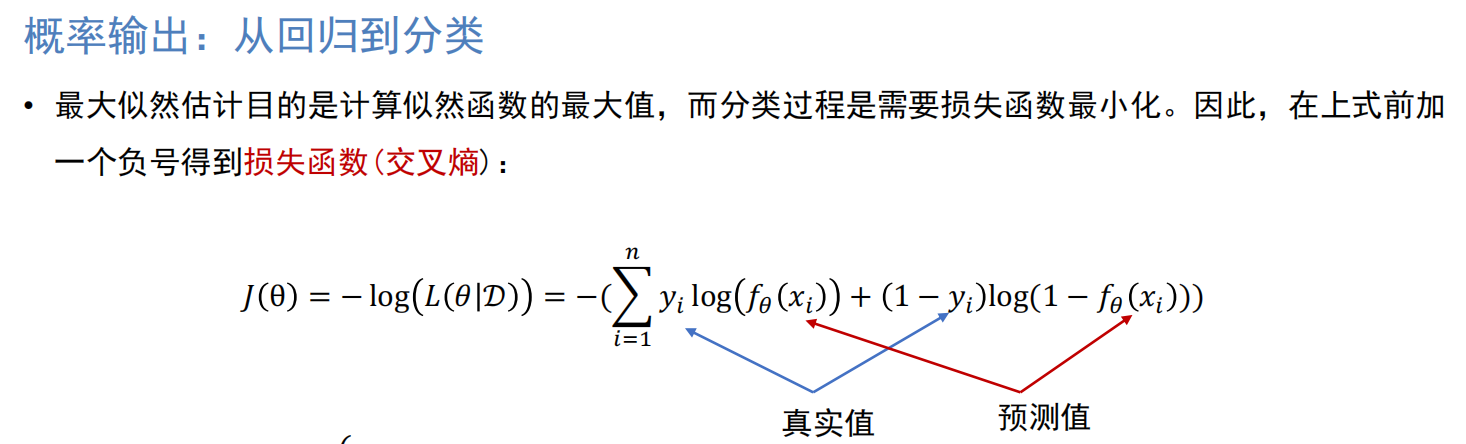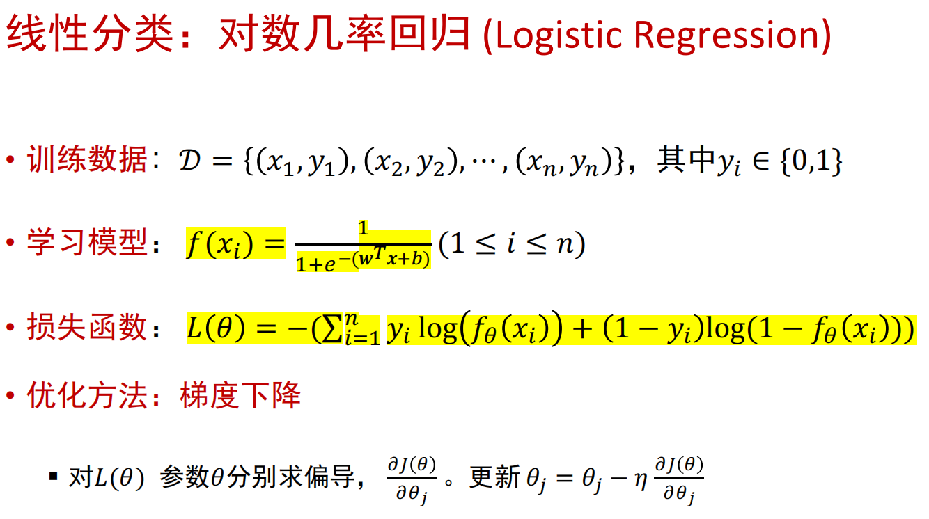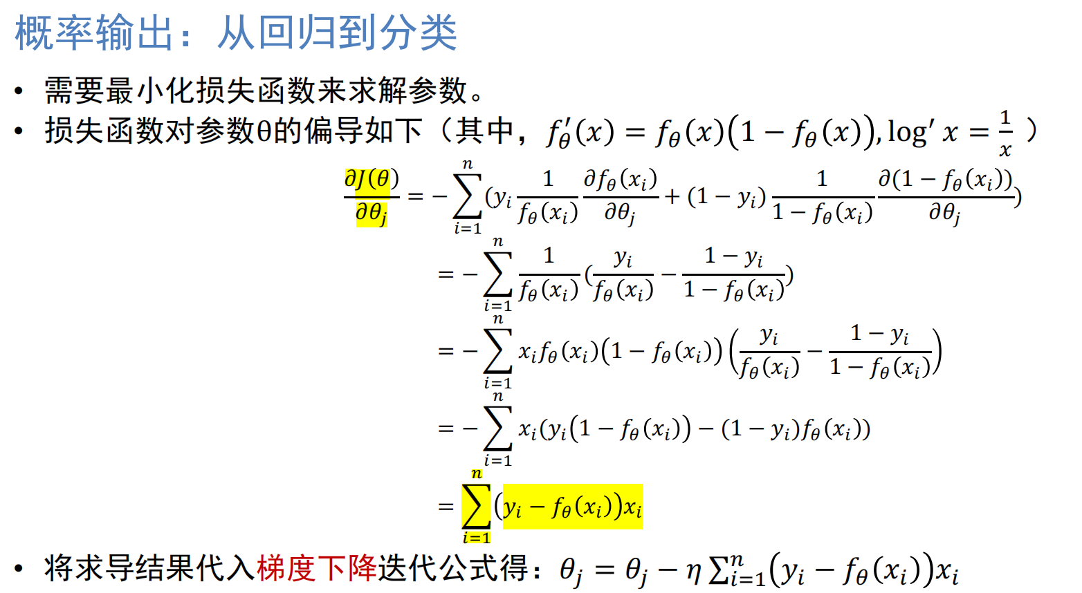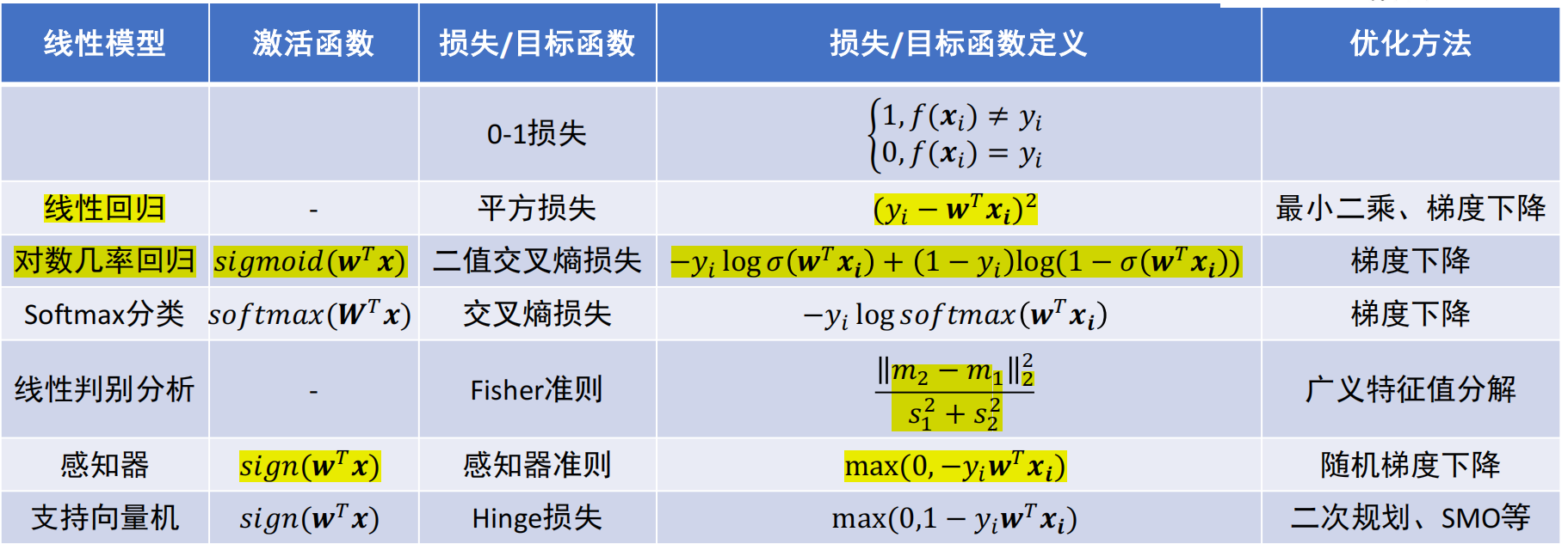 - 对数机率回归:sigmoid激活函数,将回归模型转为线性分类模型;softmax函数将二分类拓展至多分类