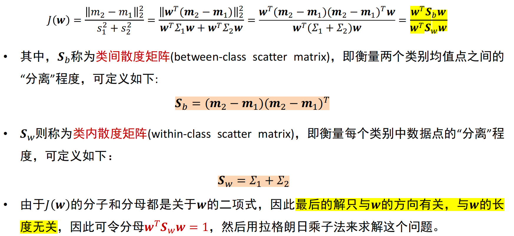 - 目标函数最大化:f(w)=||m1-m2||2/(s12+s2^2)