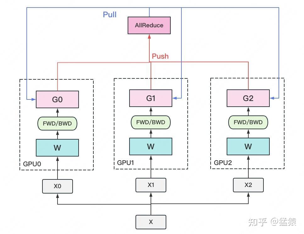 - 聚合并下发梯度(All-Reduce): 每个 GPU 将本地梯度 G 发送给单个 GPU 做聚合(或者在不同的 GPU 上聚合梯度的某些部分);再将平均后的梯度下发到所有 GPU;