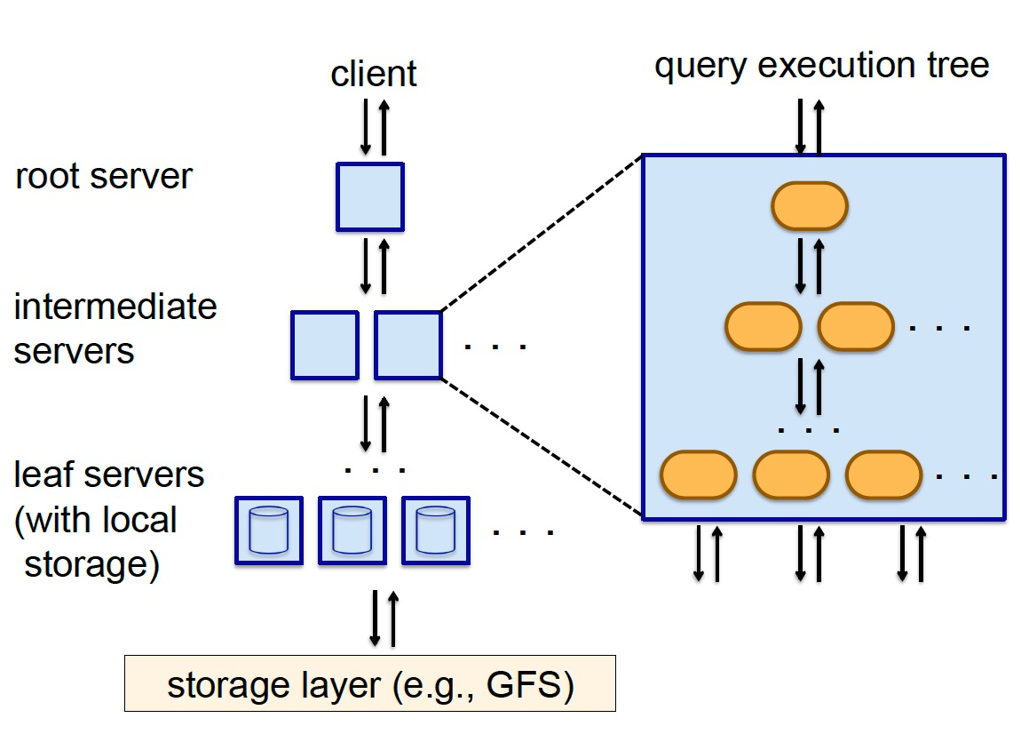 Dremel 使用 multi-level serving tree 来执行查询,根节点接受客户端查询请求,读取 metadata 并将查询重写后分发给下一级服务器;中间节点执行与根节点类似的操作,进一步将查询分发到更下一级,并聚合来自下级的结果;叶子节点直接与存储层(如 GFS 或 Colossus)通信,或访问本地磁盘上的数据,处理之后逐级汇总到根节点。