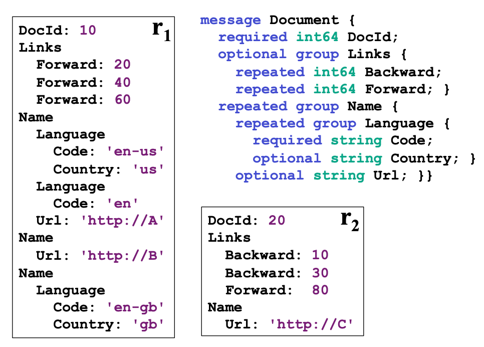 下图中包含 Schema 和两条符合 Schema 的记录(r1和r2)