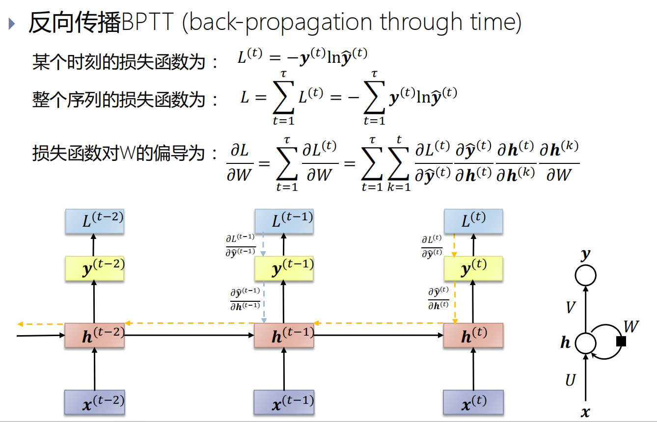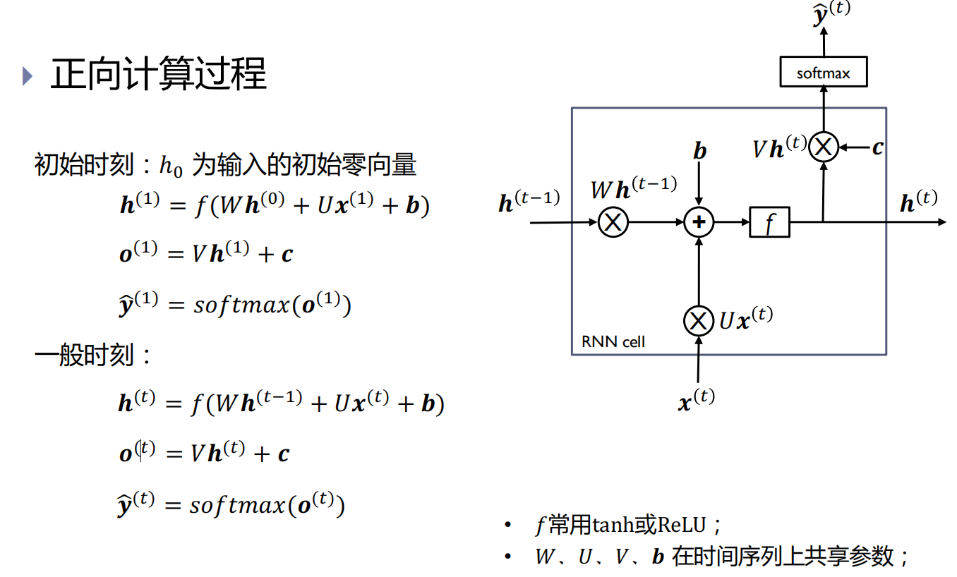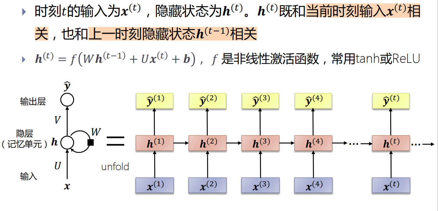 循环recurrent:对每个输入的操作都是一样的,循环往复地重复这些相同操作,每时刻有相同参数W和U(参数共享);