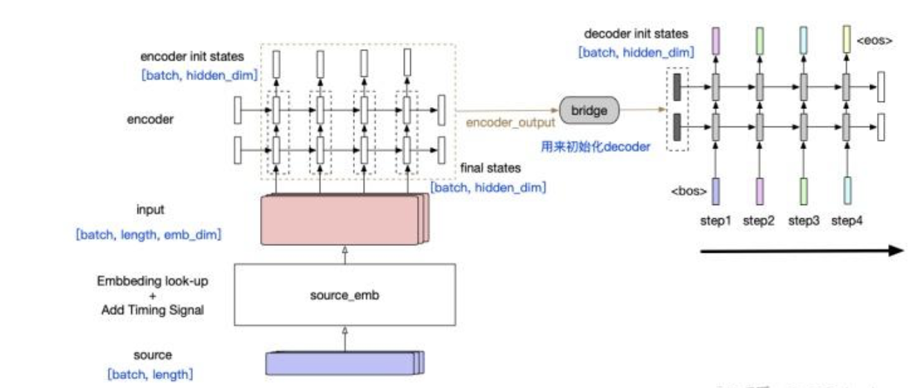 - encoder将整个源端序列(不论长度)压缩为一个固定维度的向量(encoder output):并且这个向量中包含的信息中,关于源端序列末尾的token的信息更多,因此如果序列很长,最终可能基本上“遗忘”了序列开头的token的信息;