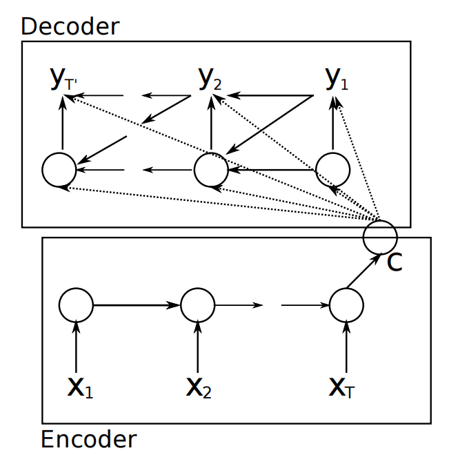 - Encoder最后一个时刻的隐状态为:一个固定长度的高维特征向量\(C=(z_1, ..., z_T)\),编码了整个输入序列的语义上下文。
