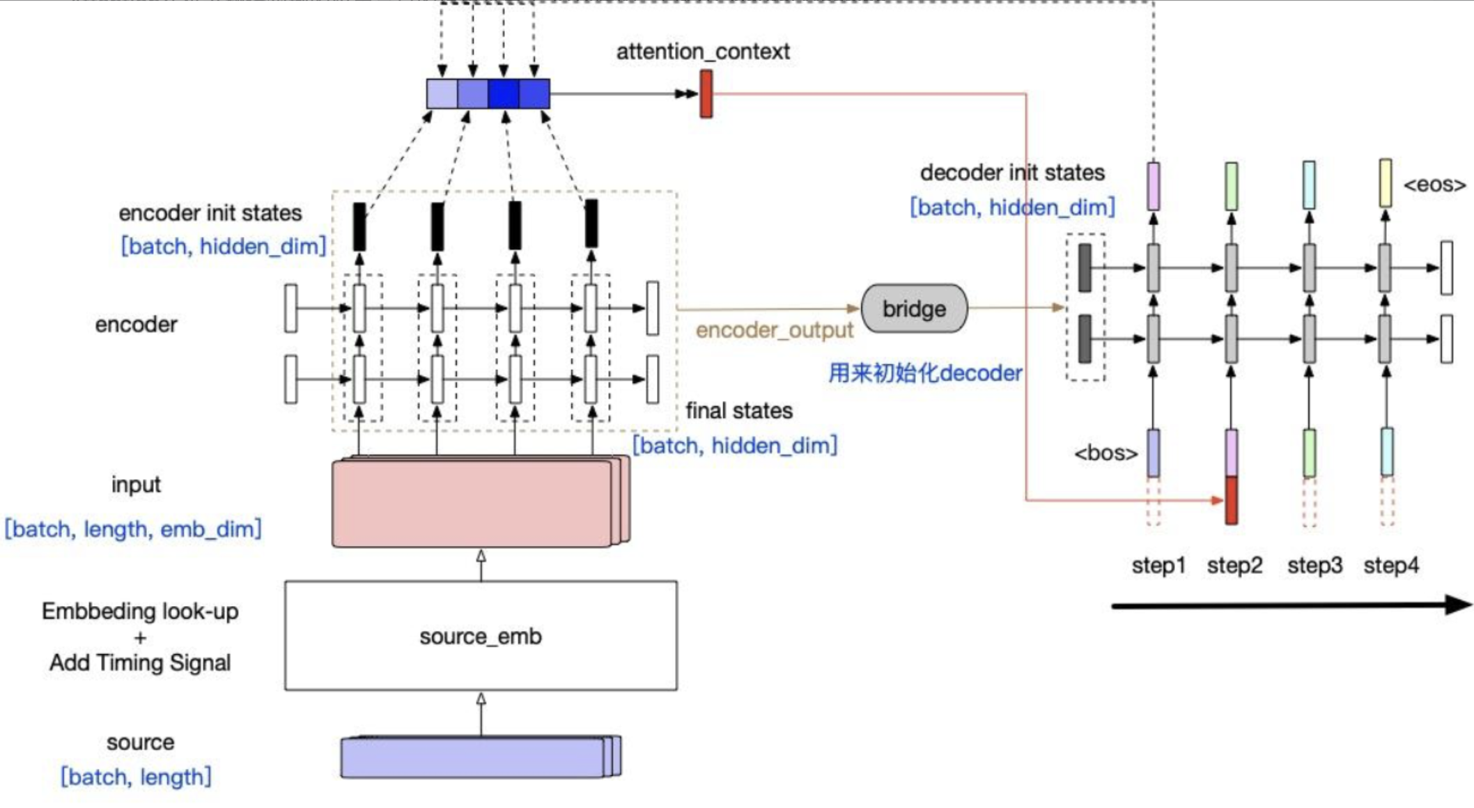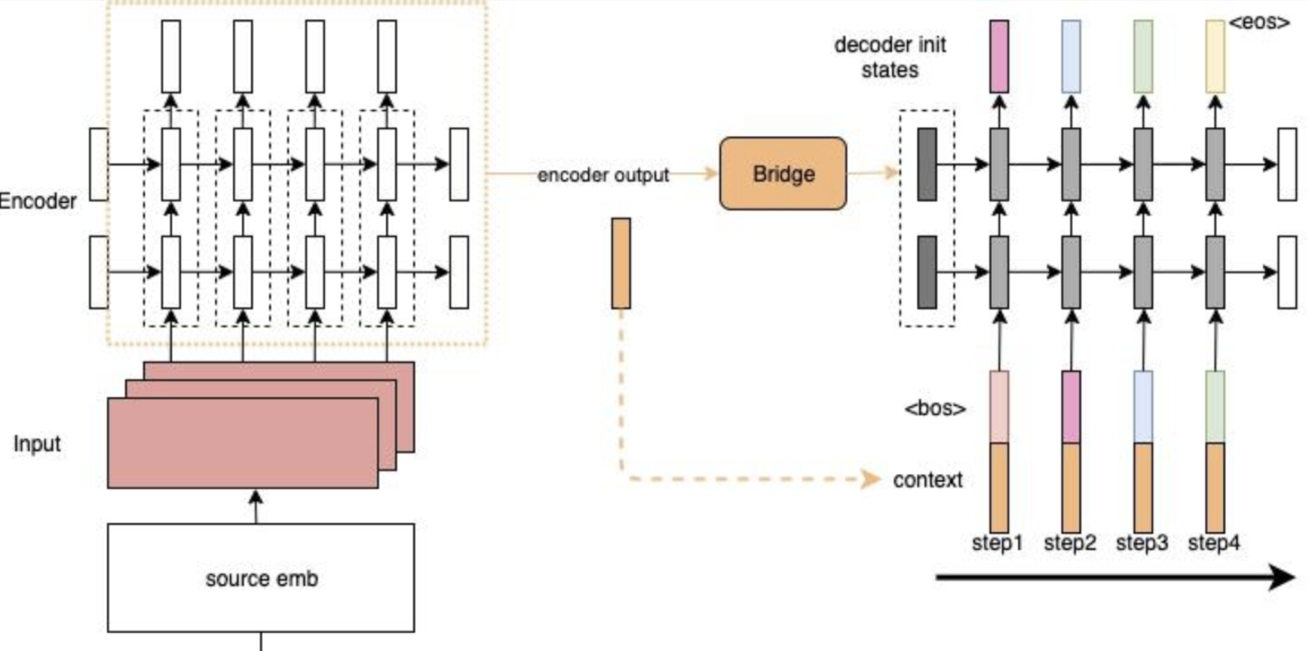 - 随着decoder timestep的信息的增加,initial hidden states中包含的encoder output相关信息也会衰减:decoder会逐渐“遗忘”源端序列的信息,而更多地关注目标序列中在该timestep之前的token的信息。