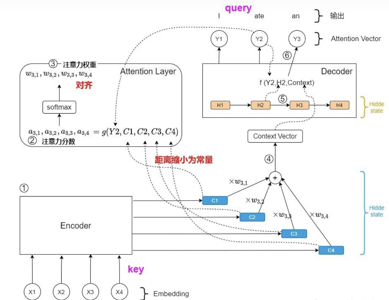 - 计算对齐系数a:在Decoder输出每一个预测值\(y\)之前,运用Encoder输出的所有隐状态向量计算注意力分数a;(反映:源序列的所有token,和目标序列当前token的相关性大小)