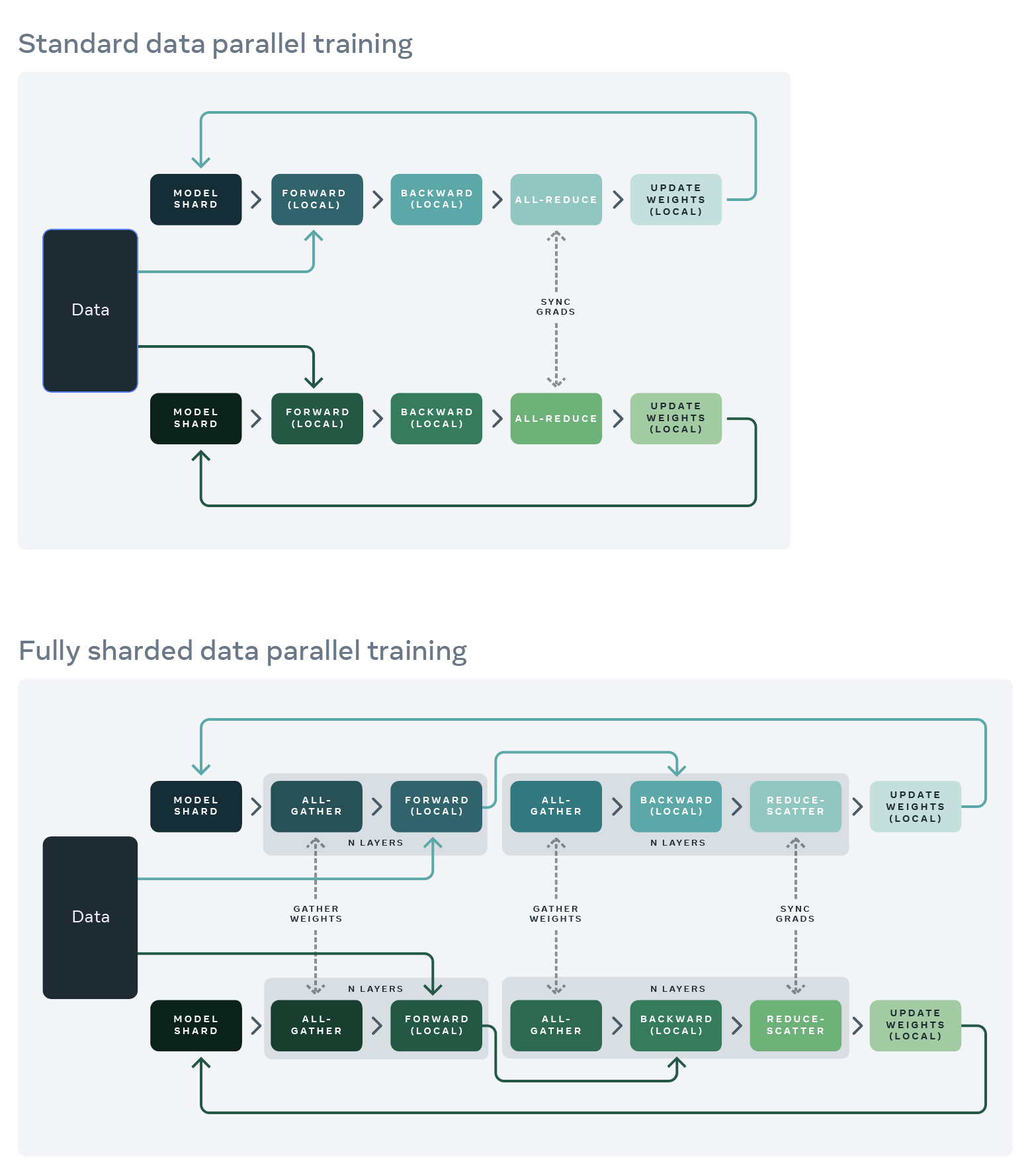 - 反向传播之后:平均本地梯度,通过一个reduce-scatter操作,共享至所有GPUs,允许每个GPU更新自己的本地权重分片。