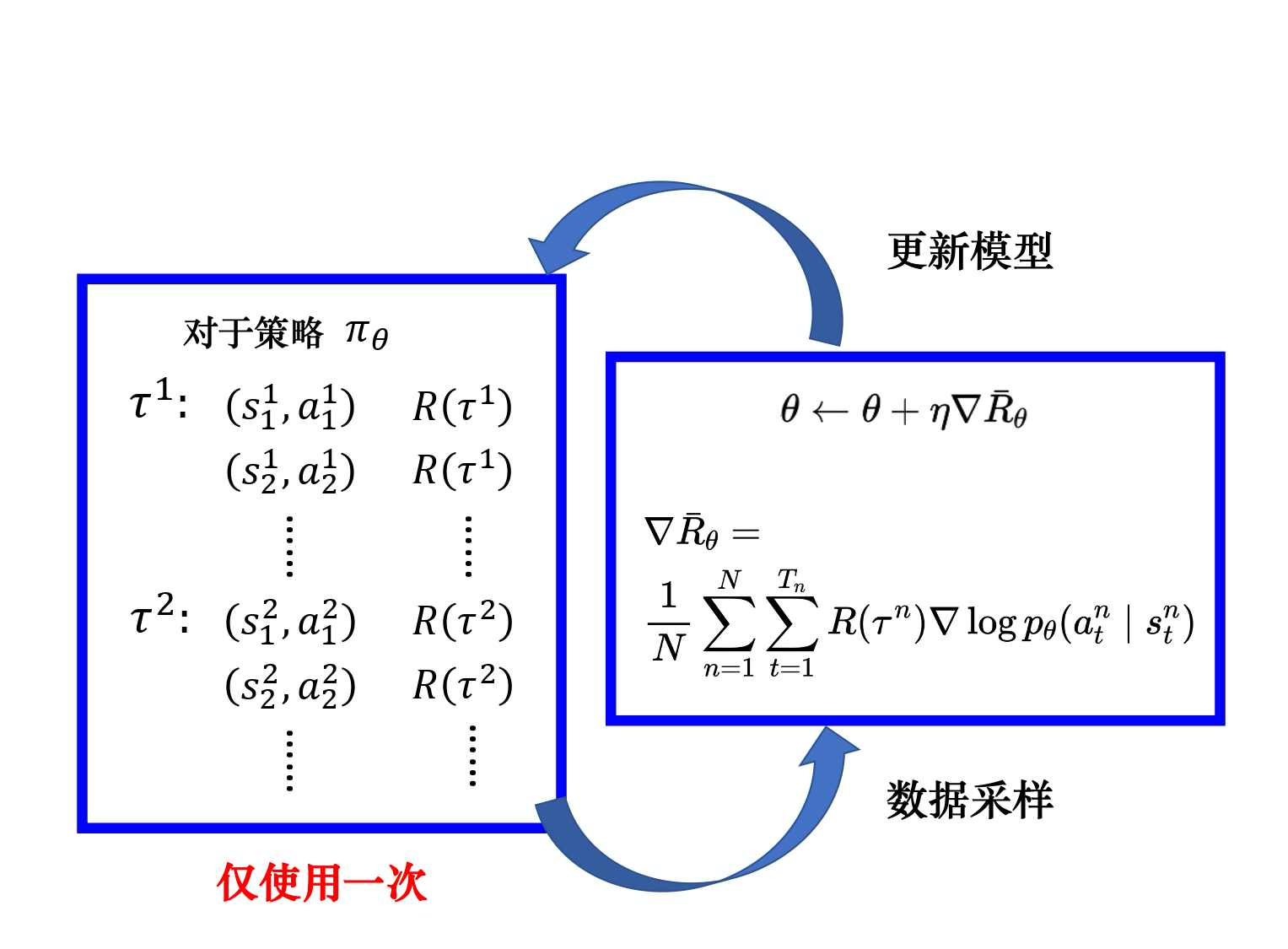 策略梯度算法为on-policy算法,因为必须使用当前策略\(\pi_\theta\)采样得到的数据计算梯度(期望\(\mathbb{E}\)的下标包含\(\theta\));一般策略梯度采样的数据只使用一次。采样数据->更新参数->重新采样数据。