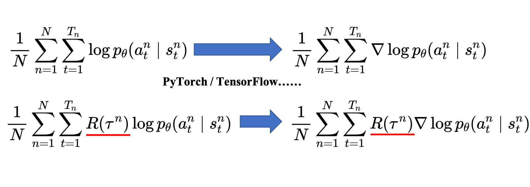 强化学习与分类问题唯一不同的地方在于:loss 之前乘一个权重,即整场游戏得到的总奖励\(R(\tau)\).
