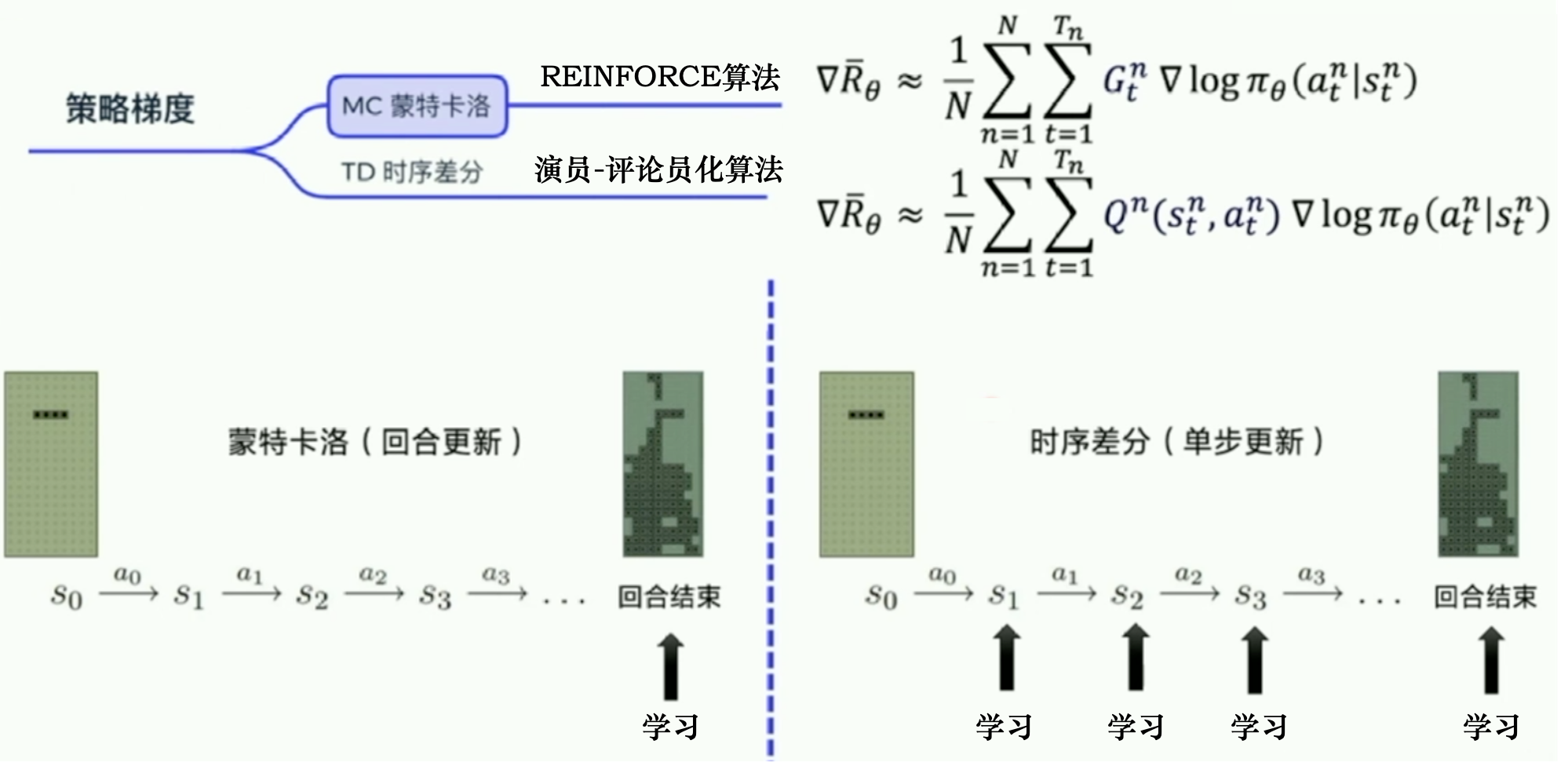 REINFORCE 算法每次根据一个策略采集一条完整的轨迹,并计算这条轨迹上的回报。这种采样方式方差较大,学习效率较低。