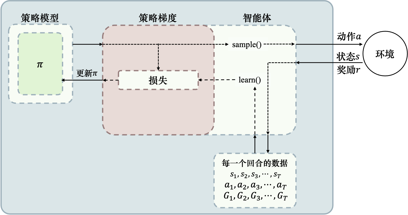 - 执行 learn() 函数,使用数据构造 loss 并更新策略模型(on-policy).