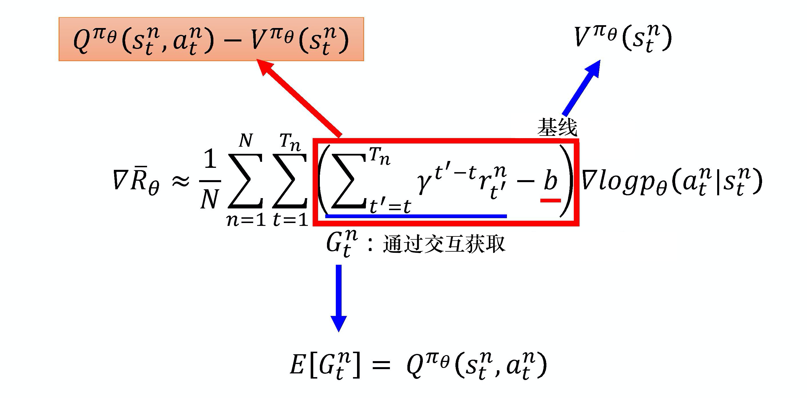 \(G\)的期望值为:\(\mathbb{E}[G_t^n]=Q_{\pi_\theta}(s_t^n, a_t^n)\);利用价值函数\(V_{\pi_\theta}(s_t^n)\)表示 baseline,含义为:在某个状态\(s\)一直与环境交互直至游戏结束的期望奖励。(\(V_{\pi_\theta}(s_t^n)\)不涉及动作,是\(Q_{\pi_\theta}(s_t^n, a_t^n)\)的期望值。