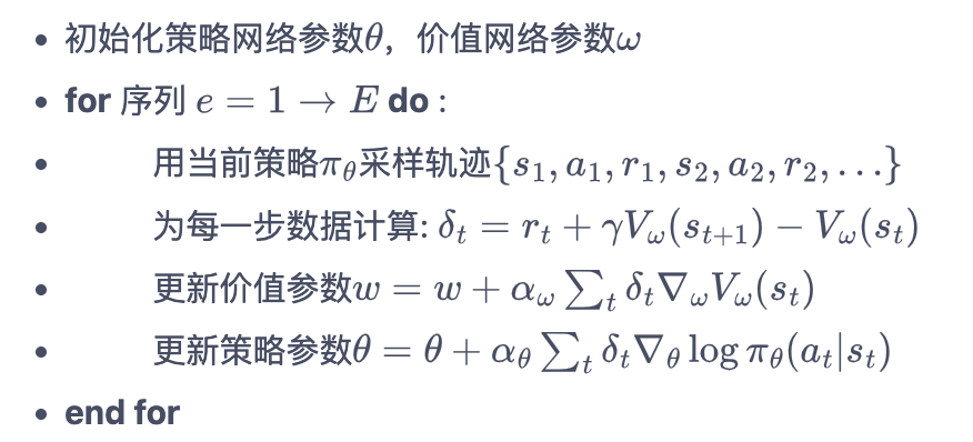 Actor-Critic 算法结合策略梯度和时序差分,Actor 对应策略函数\(\pi_\theta(a|s)\),即学习一个策略以最大化 Reward;Critic 对应价值函数\(V_\pi(s)\),用于对当前策略的值函数进行估计,即评估 Actor 的好坏。