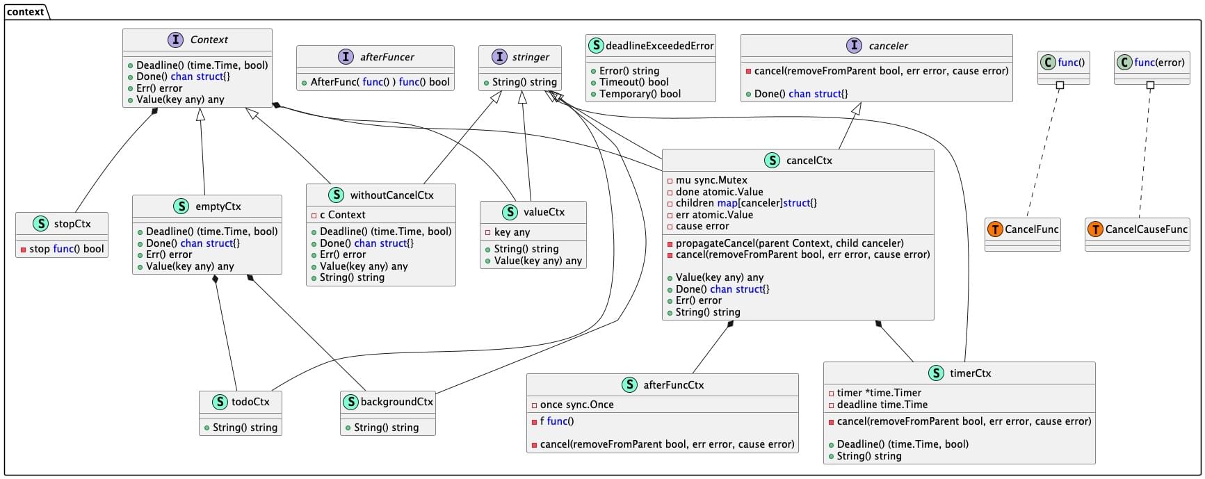 context.timerCtx内部不仅通过嵌入context.cancelCtx结构体继承了相关的变量和方法,还通过持有的定时器timer和截止时间deadline实现了定时取消的功能: