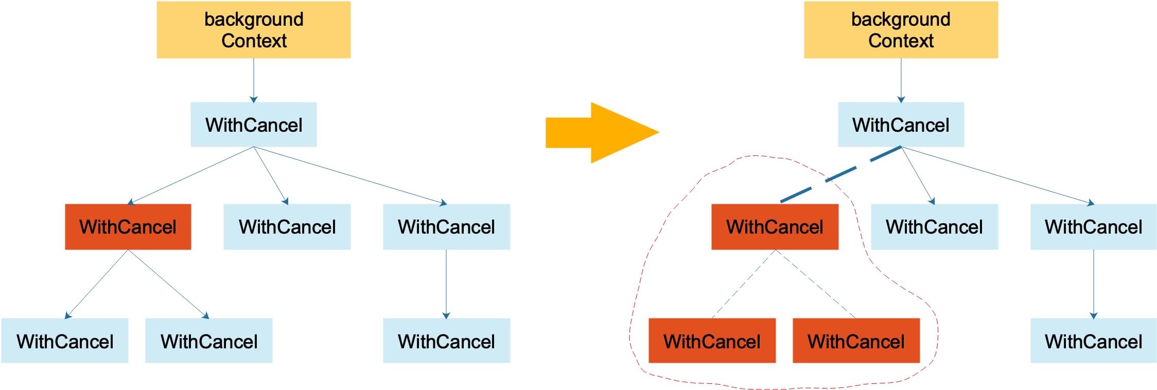Context的cancel方法后,该Context将从它的父Context的children列表中删除,实线变成虚线;虚线框内的Context也均被取消,父子关系消失。