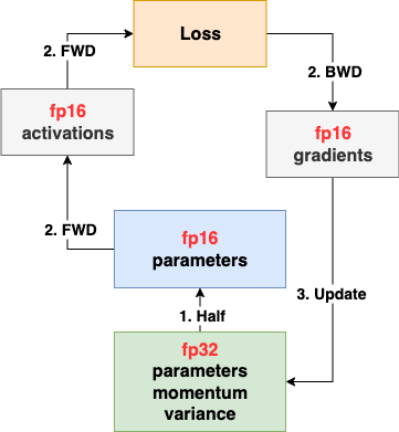 - 注意:fp16 是从更新后的 fp32 cast 得到并用于下一轮 FWD/BWD 计算(不会直接使用 fp16 gradients 更新)
