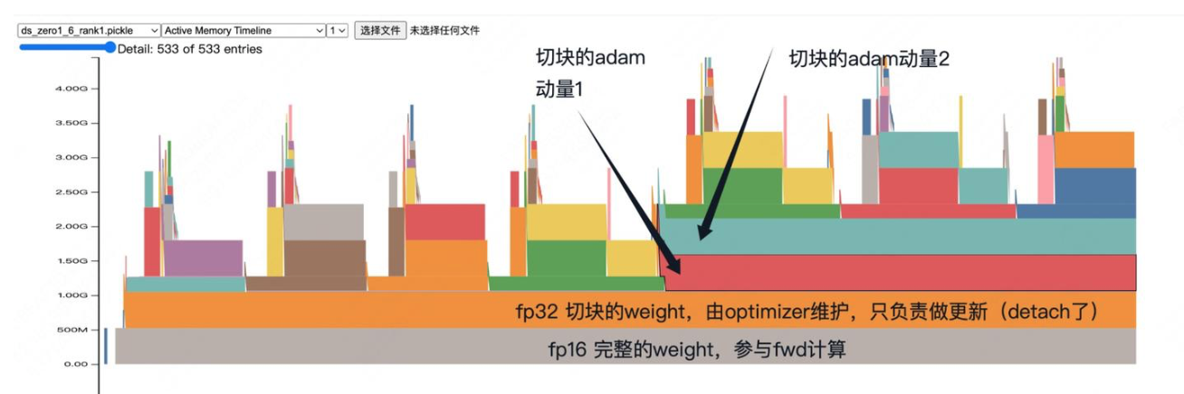 将优化器状态(fp32 parameter + fp32 momentum + fp32 variance)分片存储在各个 GPU 上: