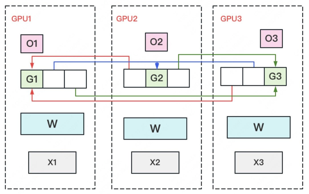 在 gradient 的 Reduce-Scatter 操作中,只需要保持每张卡上自己维护的梯度是聚合梯度。例如对于 GPU 1,负责维护 G1,其他 GPU 只需要将 G1 对应位置的梯度发给它即可。