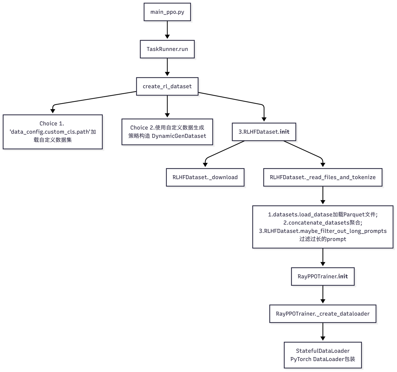 TaskRunner.run运行在远程 Ray Actor 中,流程如下(重点关注 PPO 训练器RayPPOTrainer中的 dataset 来源):