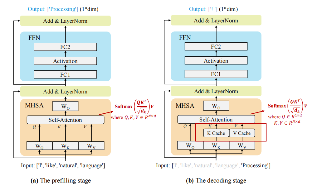 prefill阶段:输入一个prompt序列,每个transformer层的MHA模块生成KV键值对并存储在KV Cache中,最终生成第一个token,可采用并行计算加速。