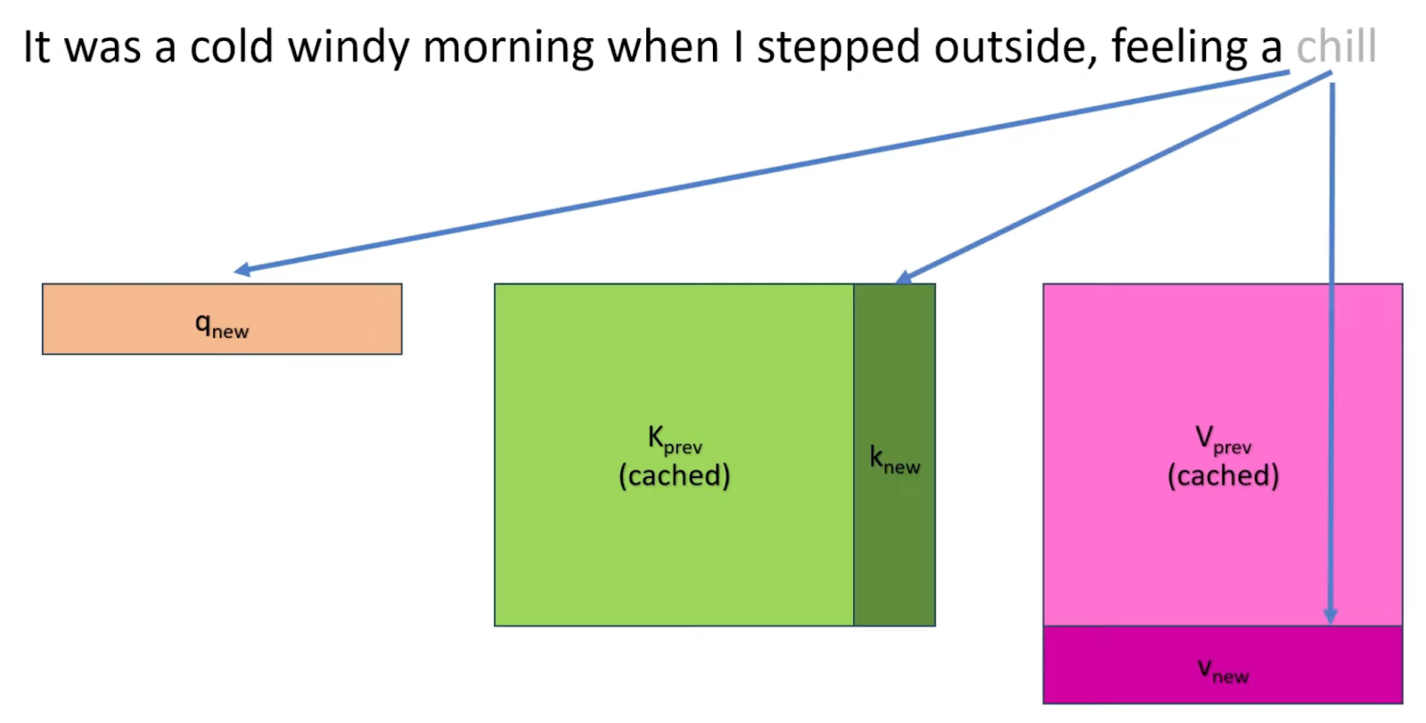 只有新生成的 token 作为下一次迭代过程的输入,所以此时 \(Q\) 的维度为 \([b, 1, h]\),即只有新 token 作为 Q。