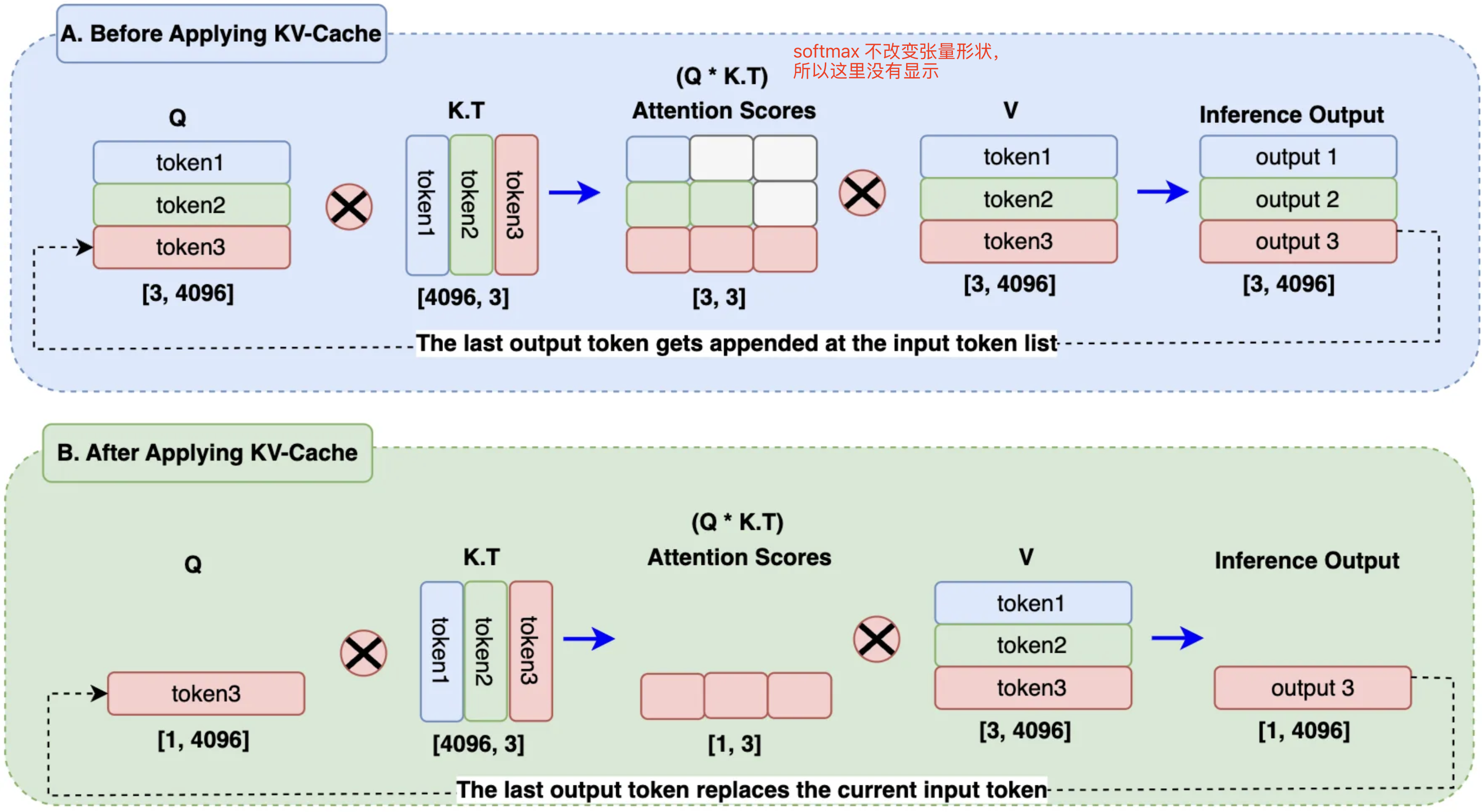 在B方案中,使用输出token替换查询嵌入中的输入token,且KV Cache存储之前生成的 token。因此在计算attention score时,只需要使用一个查询token,再加上KV Cache中的已有 token 就可以了,节省了矩阵乘法的计算量。在处理大规模序列和大批量数据时,显著降低计算开销。