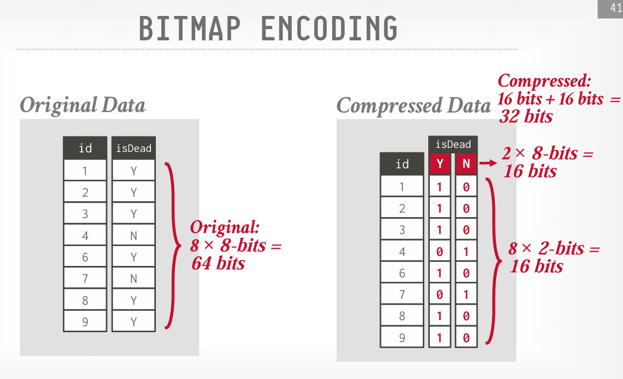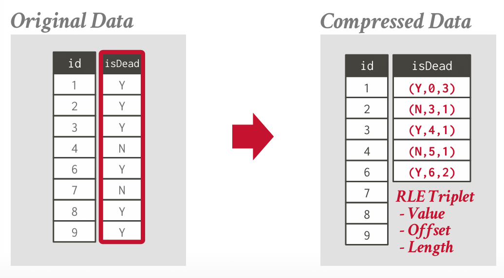 - 列级别:对多个元组中存储的一个或多个属性值进行压缩(仅限于 DSM)。允许使用更复杂的压缩方案。