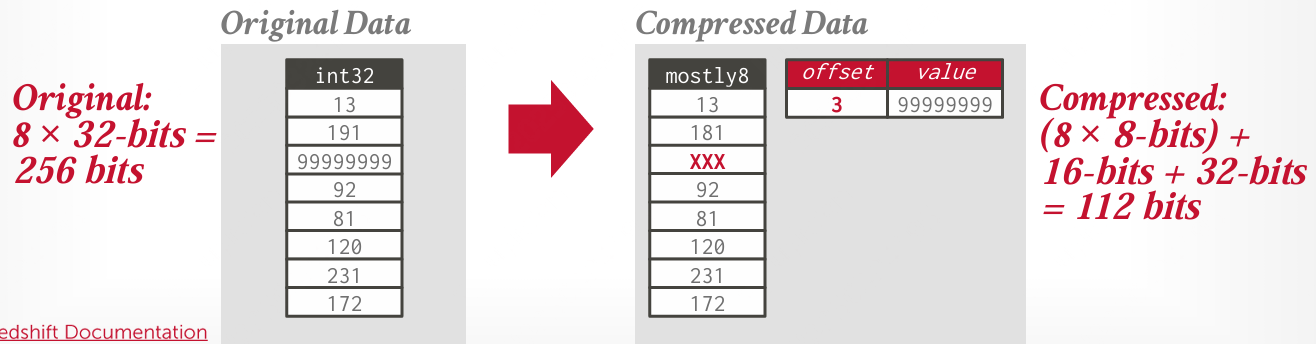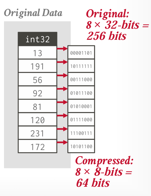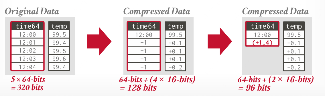 一个使用原始压缩的例子是: MySQL 的 InnoDB。DBMS 会压缩磁盘页面,将它们填充为 2KB 的倍数,并将它们存储到缓冲池中。然而,每次 DBMS 尝试读取或更新数据时,缓冲池中的压缩数据必须首先解压缩;对于盲写操作,不需要解压缩。