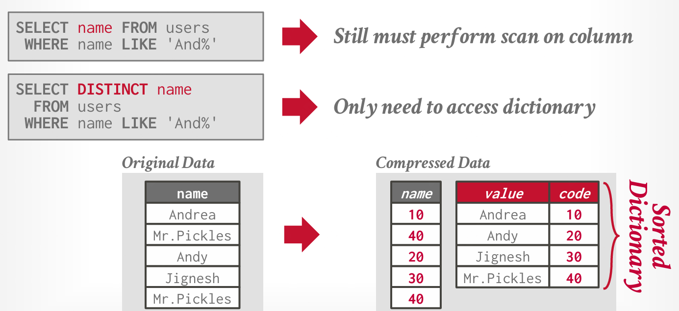 原始压缩方案并未考虑数据的高层次意义或语义。因此,无法利用延迟物化,因为 DBMS 无法知道何时可以延迟解压缩数据。
