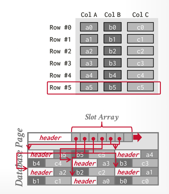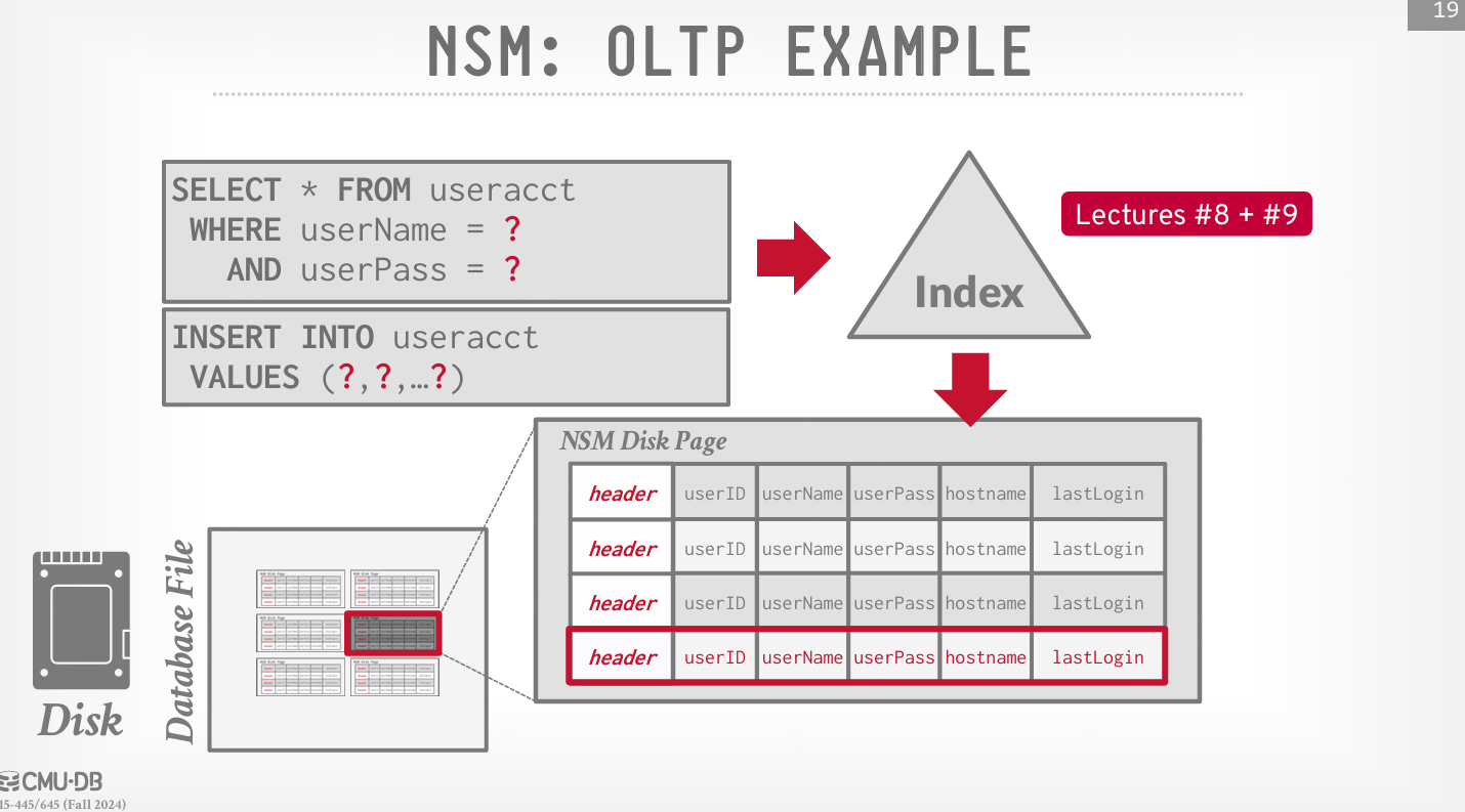 NSM 主要针对 OLTP 场景,要求高性能的随机写入,每次访问大多是单个实体。这种方法的优点是,只需要一次读取就可以获取单个元组的所有属性。NSM 页面通常是 4KB 硬件页面的常数倍。