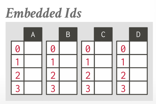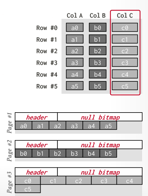 由于每个列中的值长度相同,DBMS 可以使用 偏移量(offset) 来确定每个属性值在行中的位置。当 DBMS 需要重建一个元组时,它可以利用每个属性的固定长度来准确计算该元组中每个属性值的位置。