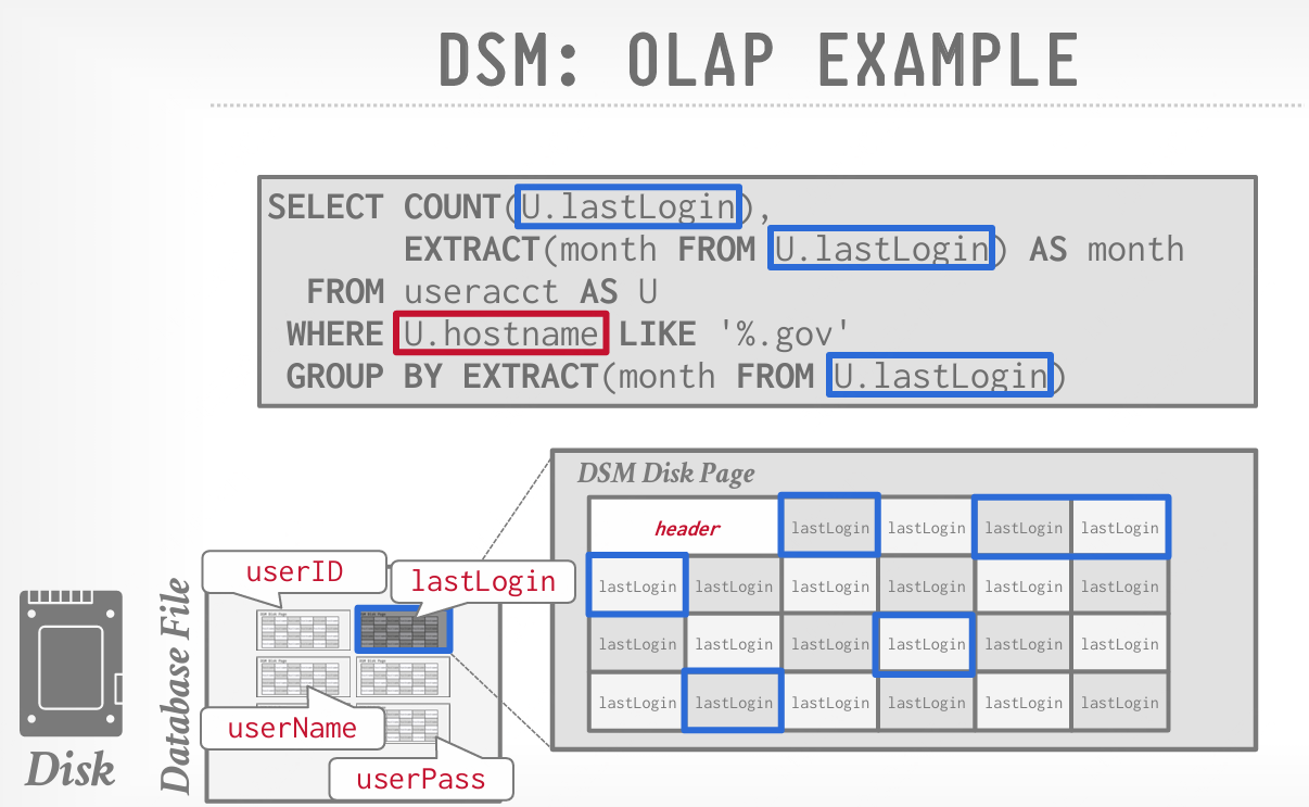 DSM适合 OLAP 工作负载,其中有许多只读查询,需要对表的子集进行大规模扫描。
