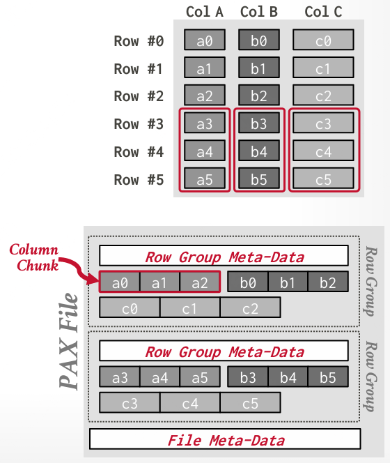 PAX 文件包含一个全局头,其中包含指向文件的行组的偏移量的目录;每个行组维护自己的头,包含有关其内容的元数据。