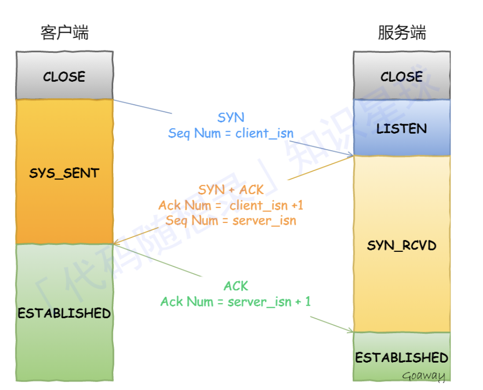 它们都需要向对方发送 SYN 控制消息并携带自己期望的初始化序列号 SEQ,对方在收到 SYN 消息之后会通过 ACK 控制消息以及 SEQ+1 来进行确认。如下图: