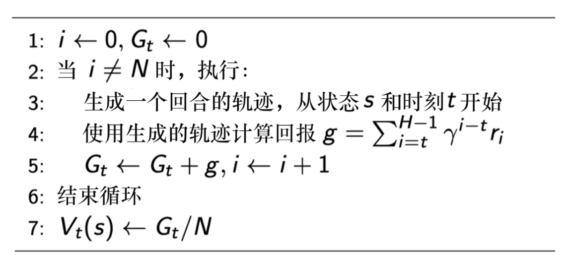 蒙特卡洛采样:从某个状态开始,把小船放到状态转移矩阵里面,让它“随波逐流”,产生多条轨迹;分别计算每条轨迹对应的回报,累积后取平均值,得到某个状态的价值。