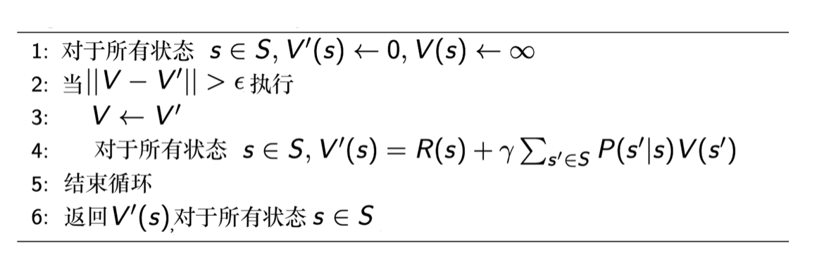 \[ V^{k+1}(s)=\max_{a\in A}[R(s, a)+\gamma\sum_{s'\in S}p(s'|s, a)V^k(s')] \]