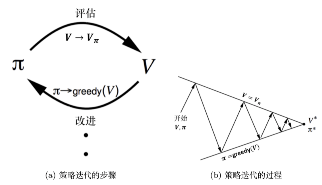 \[ \pi^0\overset{\text{策略评估}}{\rightarrow}V_{\pi^0}\overset{\text{策略提升}}{\rightarrow}\pi^1\overset{\text{策略评估}}{\rightarrow}V_{\pi^1}\overset{\text{策略提升}}{\rightarrow}\pi^2 \overset{\text{策略评估}}{\rightarrow}...\overset{\text{策略提升}}{\rightarrow}\pi^* \]